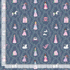 This enchanting fabric features a whimsical design set against a deep blue background, adorned with illustrations of princesses, castles, unicorns, swans, and carriages, all framed by delicate floral and vine motifs. The pattern is playful yet elegant, perfect for creating magical projects for both children and adults, from clothing to home decor, bringing a touch of fairy-tale charm to any setting.