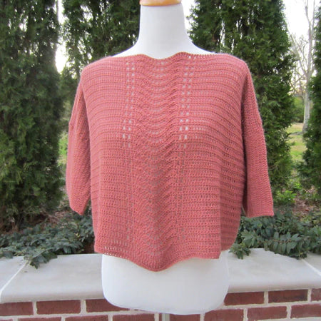 (45/50/55)" [114/127/140]cm around bust; (16.5/18/19.5)" [42/46/50] cm from top curve of neck to tip of bottom curve of center lace section; (37.5/39/40.5]cm sleeve end to sleeve end; (18.5/21/23.5)" [47/53/60]cm around neckline