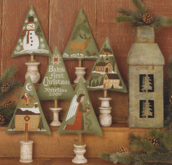 Cross stitch pattern from Prairie Schooler featuring Christmas scenes on trees!