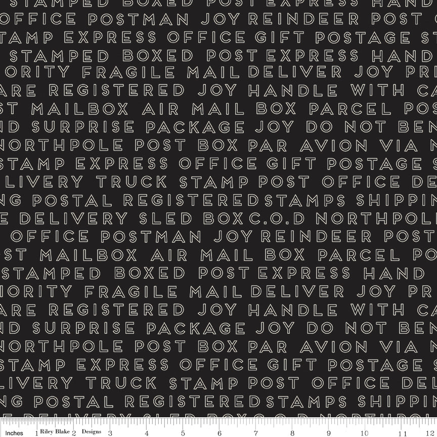 Riley Blake Designs, Christmas Delivery by Carta Bella. 100% cotton, pattern C7335-BLACK, Christmas Delivery Text Black.