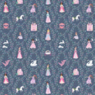 This enchanting fabric features a whimsical design set against a deep blue background, adorned with illustrations of princesses, castles, unicorns, swans, and carriages, all framed by delicate floral and vine motifs. The pattern is playful yet elegant, perfect for creating magical projects for both children and adults, from clothing to home decor, bringing a touch of fairy-tale charm to any setting.