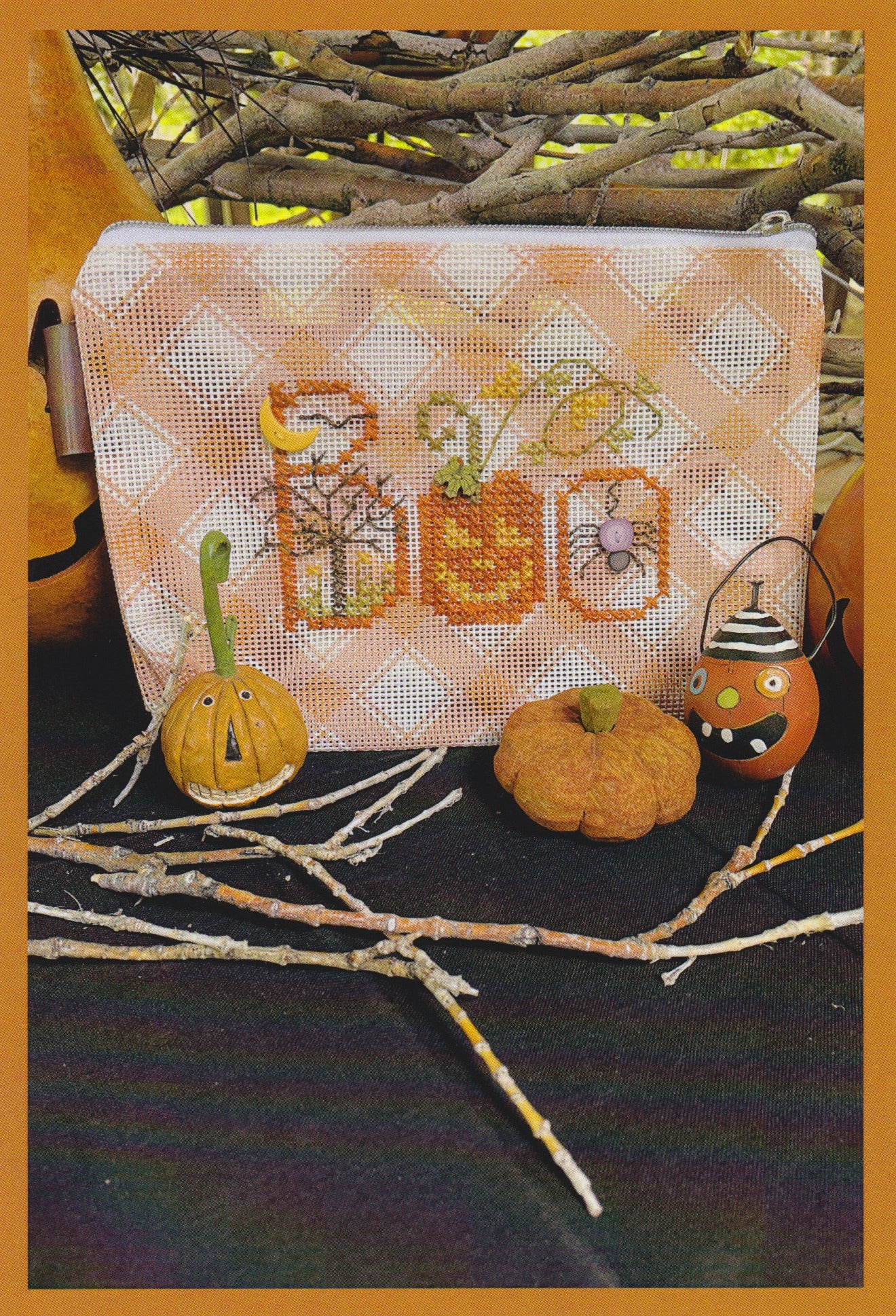 Cross stitch pattern from Shepherd's Bush featuring a Halloween bag with the word Boo onto a Mad for Plaid mini bag.