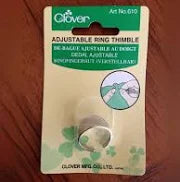 CLOVER-Adjustable Ring Thimble. This brass thimble is adjustable to most any size finger and is suitable for use with thick materials. Each package contains one thimble.