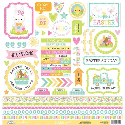 Create adorable Easter and springtime projects with the Doodlebug Design Bunny Hop Collection Cardstock Stickers - This And That. These stickers are the perfect addition to your crafts, whether it's cards, scrapbook pages, tags, or journal and planner pages. With their repositionable adhesive, you can easily move and adjust them until they're just right. The stickers feature charming images of bunnies, baby chicks, a bunny driving a truck, and the sentiment "Easter is on its way" and more. Made with high-quality cardstock, these stickers have substance and durability. Plus, they are acid and lignin free, ensuring that your creations will last for years to come. Coordinate these stickers with the rest of the Bunny Hop Collection (sold separately) for a cohesive and delightful Easter-themed project.