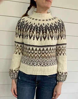 Koivua is a top-down circular yoke sweater that features stranded colorwork and texture created with simple knit and purl stitches, making this an engaging yet not difficult sweater to knit. The sleeves balloon gently and are finished with a simple, classic i-cord. The body and sleeve lengths are easily adjustable, keep in mind changes will alter the yardage required.