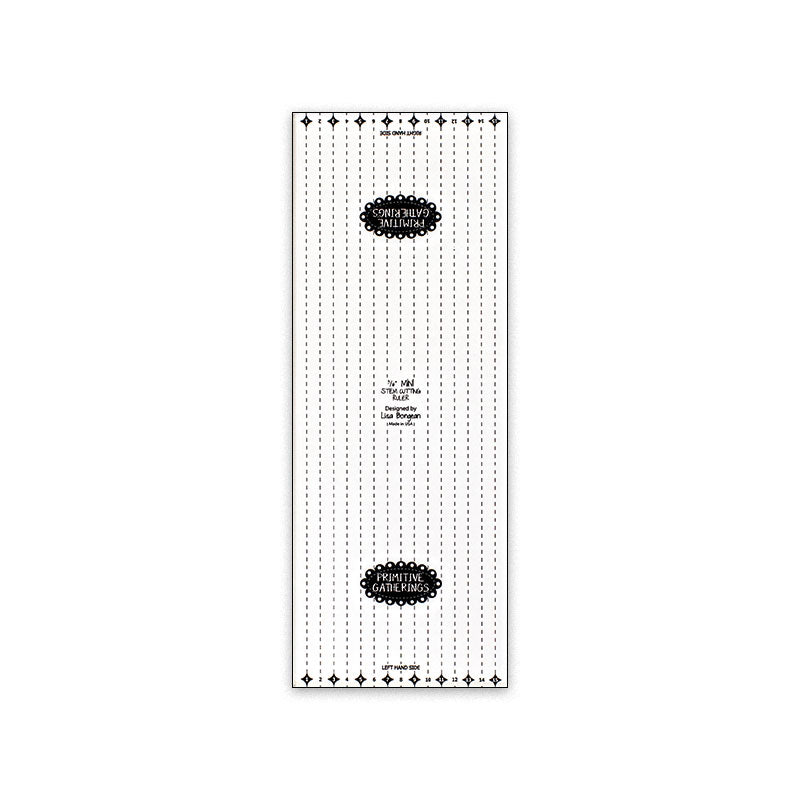 Wool Stem Cutting has just gotten easier!! Lisa has designed a set of rulers to cut multiple 3/16" stems for wool appliqué...Why 3/16"? If you want your wool stems to be 1/4" for your design we cut them 3/16" and then after they are stitched they look 1/4"... the rulers have a right and left hand side...If you wish to cut 6-3/16" stems you would cut a clean edge, line your ruler up on the 6 and then proceed to cut and slide the ruler until all the stems are cut without lifting and re-aligning after just one cut. We have two sizes for cutting short stems or long one for longer vines.