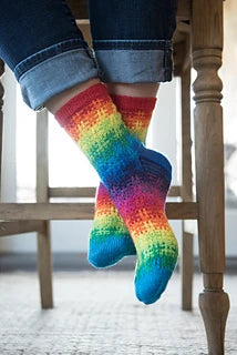 Somewhere: Dorothy Gale dreams of a magical world that lies just beyond the rainbow. These top-down socks use MothyAndTheSquid rainbow mini skeins to create your own magical footwear. Knit with only one color at a time, these socks use the simple technique of slipping stitches to give the appearance of stranded colorwork. There are no wrapped stitches and the pattern is both charted and written, making this sock much simpler than it looks. This pattern is perfect for working with sock scraps or a good excuse to buy those mini skeins you’ve been eyeing. Use similar colors to create your own fade or high contrast colors for socks that stand out. No matter where you’re going, these socks will always take you Somewhere!