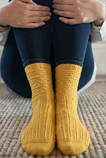 Just Follow: “It’s always best to start at the beginning,” as the Good Witch of the North would say. What better way than to begin at the toe? With this sock you will journey up the foot to gusset increases and a heel flap, then trek your way up to the cuff. A simple textured rib stitch creates golden pathways that lead the way up the foot of the socks, while the leg combines slipped stitches with simple knit and purl to create an avenue of yellow bricks. The adventure is highlighted by Leading Men Fiber Arts’ Spotlight base, with BFL wool providing both luster and durability for your feet. The adventure is waiting, so grab your needles-- it’s time to “Just Follow the Yellow Brick Road!”