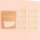 Sew a little love right into your garment, quilt or special handmade project! These high quality woven labels feature beautiful metallic gold thread and a pinky coral heart on a cream colored background. They are super soft to the touch and never scratchy. The labels are fully washable and can handle the heat of the dryer.