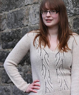 This pullover features lace inspired by this wave-battered and windswept landscape, knit in a yarn dyed on the Isle of Skye.