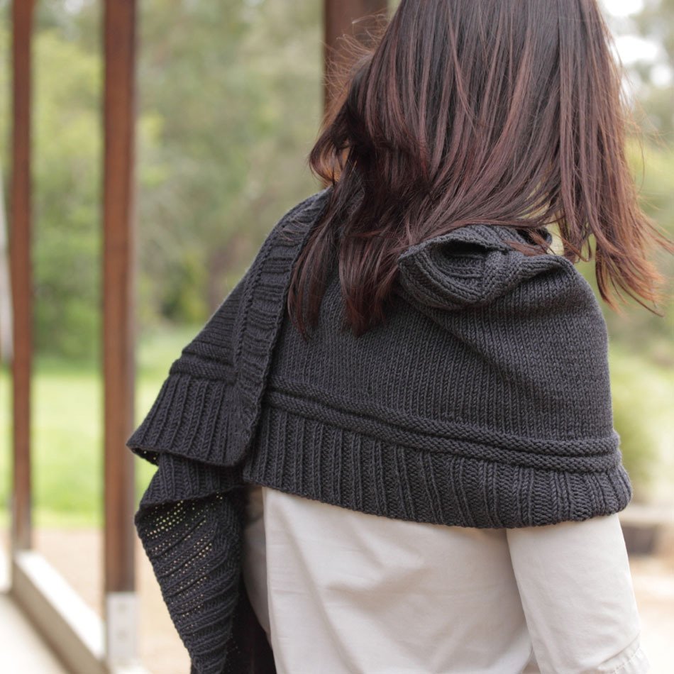 Shawl begins with a provisional cast on. It is worked flat lengthwise with short row shaping to create the isosceles trapezium shape. Stitches are picked up along the narrow end and both long sides of the shawl to work 3 sides with 2x2 Rib edging to finish.
