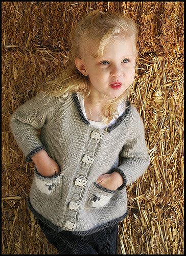 A sweet sheep inspired cardigan that could be worn by a boy or girl. This pattern offers simple construction with just a little tastes of intarsia work. It is worked in one piece from the bottom up with almost no seaming! Made out of a super soft merino wool, this cozy cardigan will be a must have piece for Fall and Winter.