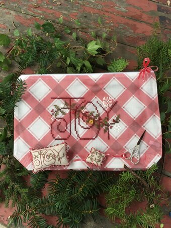 Bag is stitched on Mad for Plaid Bag- Berry. Fob and Pincushion are stitched 32 ct Flax Belfast using Weeks Dye Works or DMC Pearl Cotton.