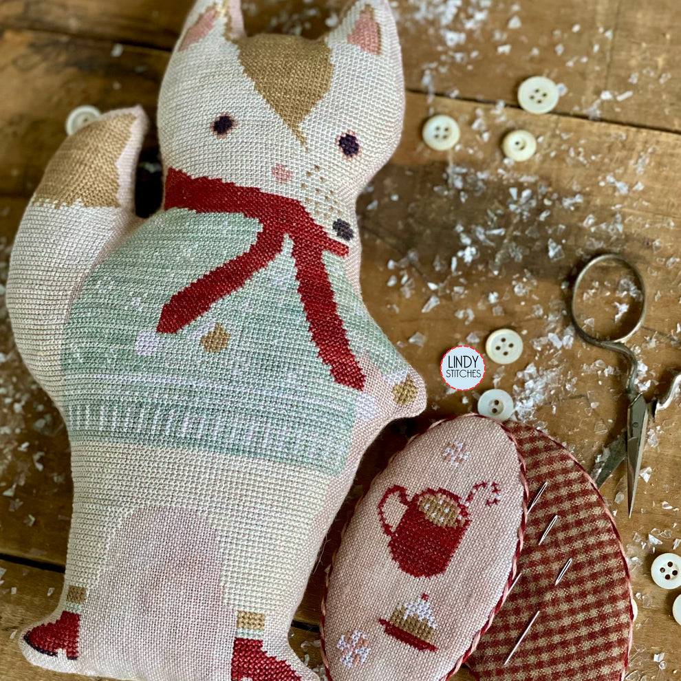 Cross stitch pattern from Stacy Nash Primitives featuring a winter fox with a cup of warm cocoa!